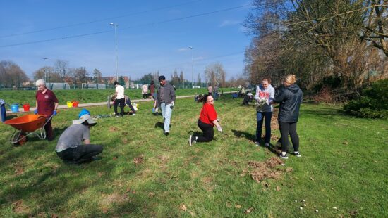 The volunteers planting wildflower plug plants, grown from seed, to maintain a perennial meadow established in 2012.