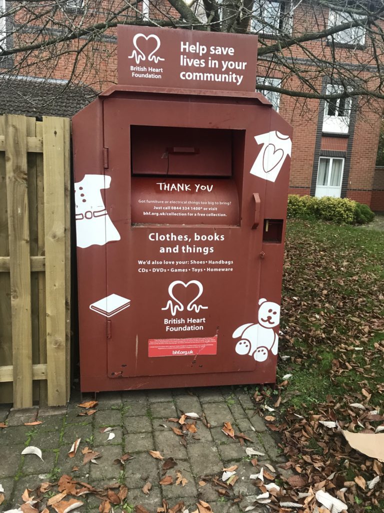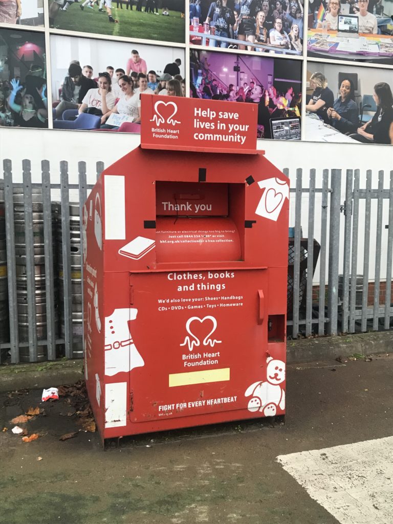Image in the foreground of a piece of cardboard, with 'Re-home your clothes on campus' written on it. In the background is a British Heart Foundation donation bank, located outside the student union