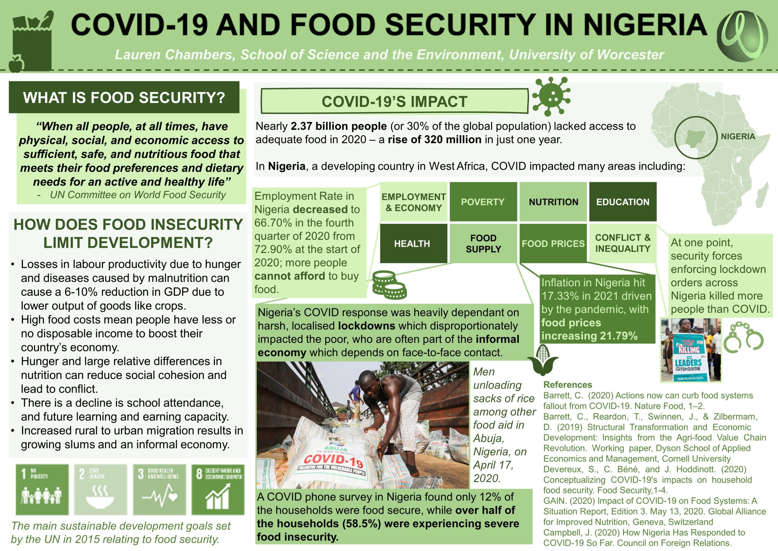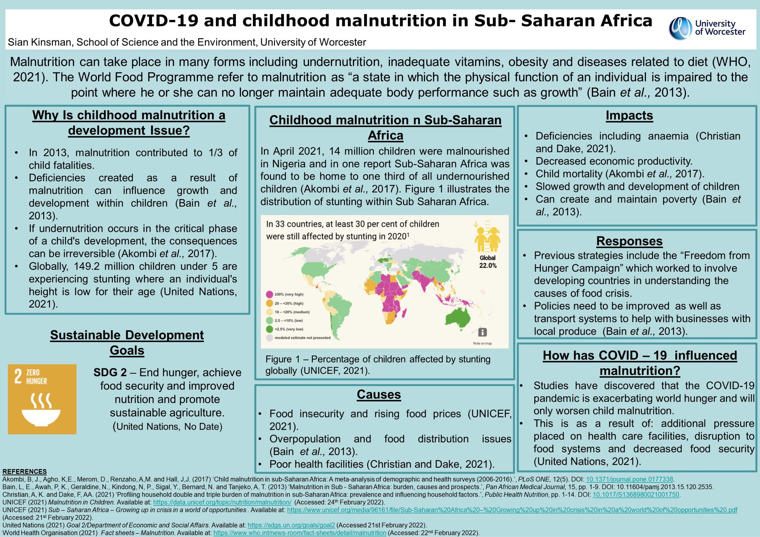 The conference also gave a platform for Geography students to present their coursework posters. These outlined the impacts of COVID-19 on a range of different development issues, including food security, childhood malnutrition, period poverty, and water and sanitation issues.