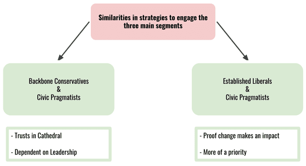 All the main segments share common values. In the areas of overlap, we are able to use the values to create targeted messages. By using this diagram, we designed messages that engage multiple segments by using shared values. For example, both Civic Pragmatists and Established Liberals are compromising, and we can use that value in creating targeted messaging.