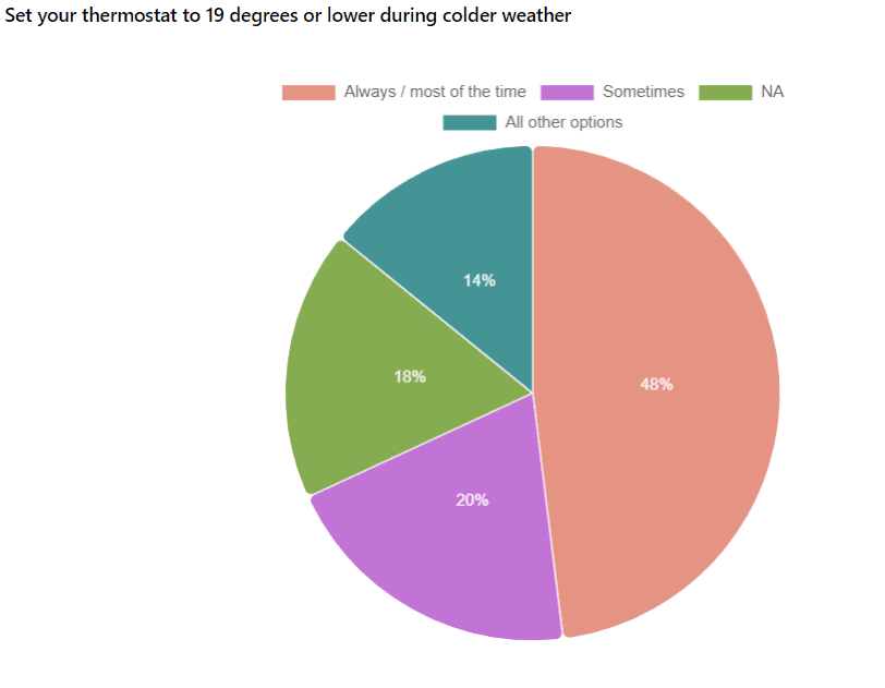 Whilst Waste Reduction has less of an impact on carbon reduction it’s great to know that 81% of staff respondents always or most of the time use a reusable water bottle, coffee cup, travel mug, etc. When it comes to Recycling 62% of respondents always or most of the time check recycling labels on products before deciding how to dispose of them. This is helpful, as contamination of waste streams by putting the wrong thing in the bin, like food or half-drunk coffee, can contaminate a whole commercial bin, so it’s great most people check this out before throwing things away.