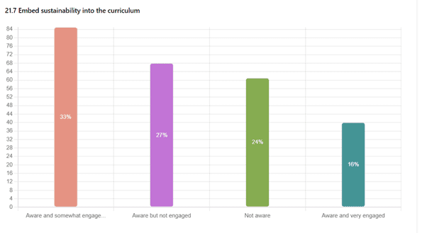 Promotion of UN’s Sustainable Development Goals: Just under half staff respondents are aware of the University’s efforts to promote the UN’s Sustainable Development Goals. Similar numbers note the work on embedding Sustainability in the Curriculum.