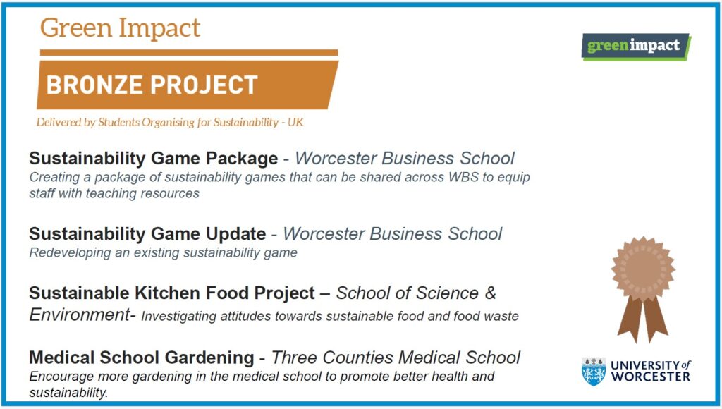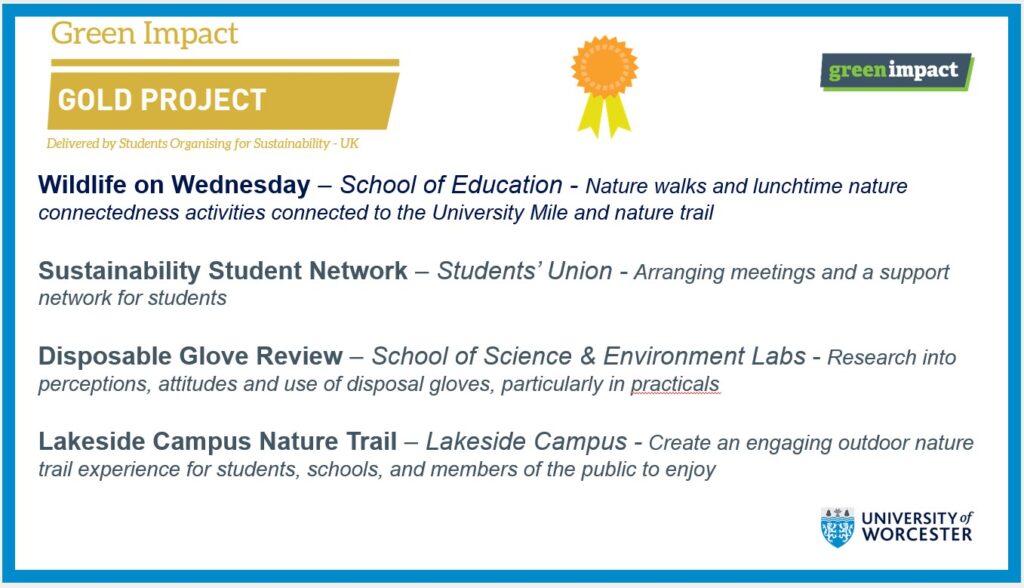 Green Impact is a change and engagement programme that aims to help staff to understand sustainability and social responsibility and give them ideas of what they can do to make a difference, as well as supporting them in achieving these actions. Students are employed to help co-create and run projects throughout the year. Learn more about the program and the details of the projects in this short slide deck.