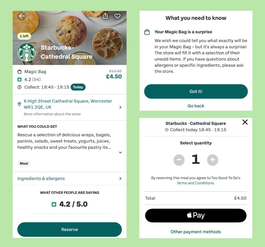 Paying for the bag only reserves it, you will then need to go to the location at the given collection times. For example, this Magic Bag from Starbucks (see picture) is for the Cathedral Square branch and is available to collect between 18:45-19:15 for only £4.50.