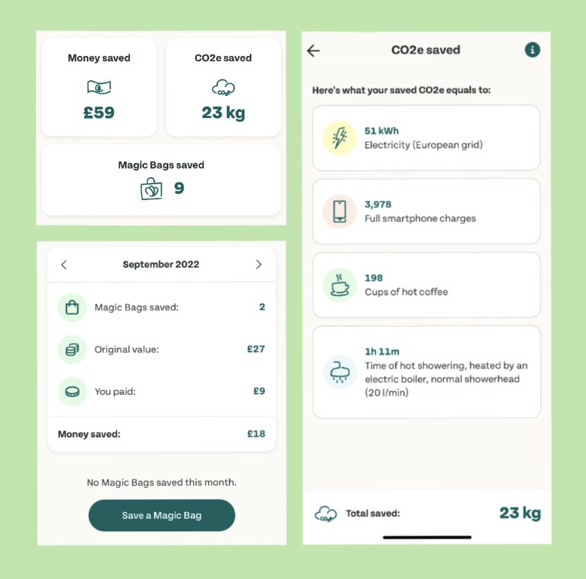 Since downloading the Too Good To Go app I have saved 9 Magic Bags from independent bakeries, Greggs, Costa, Starbucks and Grounded Kitchen. From these bags, it works out that I have saved 23kg of CO2e, equal to 51kWh of electricity. This reflects the energy used to produce this food and how much is saved from it not being thrown away or wasted.