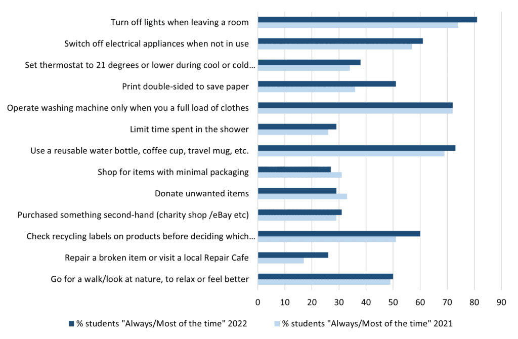 The results show a similar positive trend amongst students, with the exception of shopping to minimise packaging, donating unwanted goods and operating the washing machine only on a full load, students are more frequently undertaking all other sustainability behaviours than they did in 2021. This was particularly more evident for careful recycling, repairing, turning the lights off and printing double-sided, which all saw gains exceeding 5%.